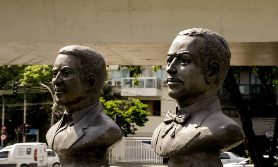 Glória e Botafogo são bairros logo atrás no ranking, mas em ambos a representatividade negra é zero entre estátuas e bustos. Além de Caymmi, o outro monumento que retrata pessoas negras na Zona Sul é dedicado aos irmãos André e Antônio Rebouças, que eram engenheiros. Juntos, os dois bustos ficam em um canteiro da Avenida Borges de Medeiros, na Lagoa, no acesso ao túnel batizado com o sobrenome da dupla.