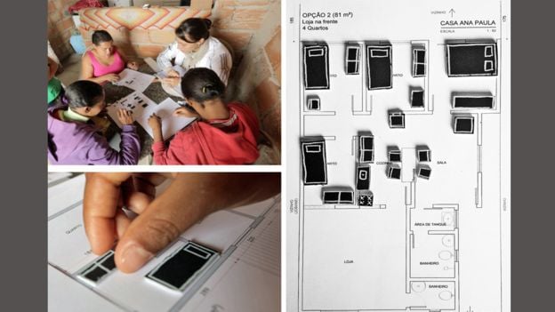 Logo nas primeiras reuniões, as moradoras receberam um “kit levantamento” para que pudessem desenhar e medir as próprias casas: pasta, trena, prancheta, lápis, caneta, borracha, apontador, papel branco, manteiga e vegetal, bloco de notas, etiquetas, um roteiro de trabalho e uma máquina fotográfica.