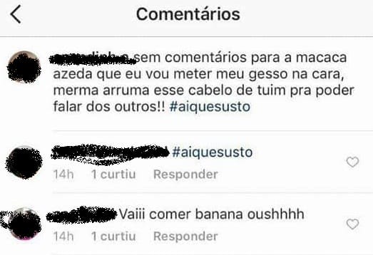 Em uma publicação, uma jovem escreveu: “Sem comentários para a macaca azeda que eu vou meter meu gesso na cara, merma arruma esse cabelo de tuim pra poder falar dos outros!!”