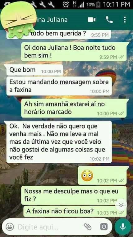 “A faxina estava ótima, mas não gostei de uma coisa que você fez”, disse a patroa, por Whatsapp, ao dispensar uma empregada doméstica. O motivo: ela usou o único banheiro da casa e comeu com seus pratos e talheres. “Além de nojenta é mal educada”, exclamou a patroa. Print da conversa viralizou nas redes. Confira