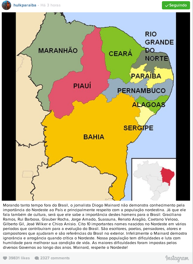 Hulk, que é natural de Campina Grande e frequentemente manifesta orgulho de suas raízes em entrevistas à imprensa, não deixou barato. “Morando tanto tempo fora do Brasil, o jornalista Diogo Mainardi não demonstra conhecimento pela importância do Nordeste ao País e principalmente respeito com a população nordestina”, cravou o jogador. Ele termina o texto com um aviso ao jornalista: “Mainardi, respeite o Nordeste!”.