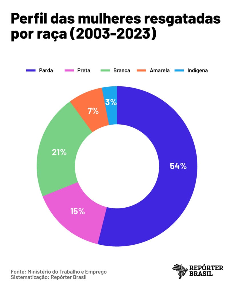 As mulheres vítimas desse crime têm um perfil de alta vulnerabilidade: 66% estudaram até o ensino fundamental e 16% eram analfabetas. Duas em cada três eram trabalhadoras rurais atuando na pecuária e em lavouras, especialmente na de café; 8% estavam ocupadas no setor têxtil. A cada dez resgatadas, sete são negras.