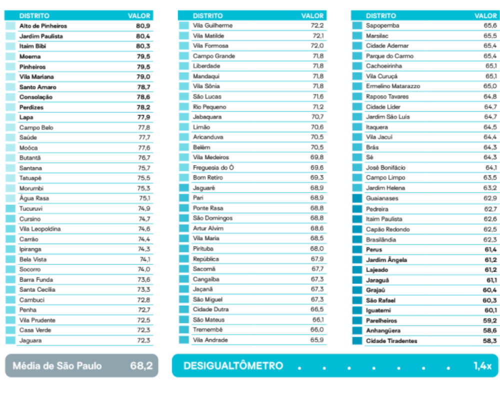 Já entre os bairros com melhores índices, nenhum está localizado na periferia da cidade. Moema, República, Vila Mariana, Itaim Bibi, Jardim Paulista, Pinheiros e Santo Amaro estão entre os sete melhores.
