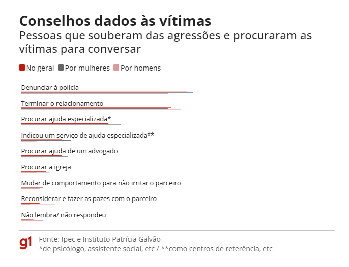 Após tomar conhecimento de casos de violência, a maioria dos brasileiros procura as vítimas para conversar e, no geral, oferece conselhos focados na segurança e no bem-estar das mulheres, como para denunciarem as agressões à polícia (53%) e terminarem o relacionamento (48%).