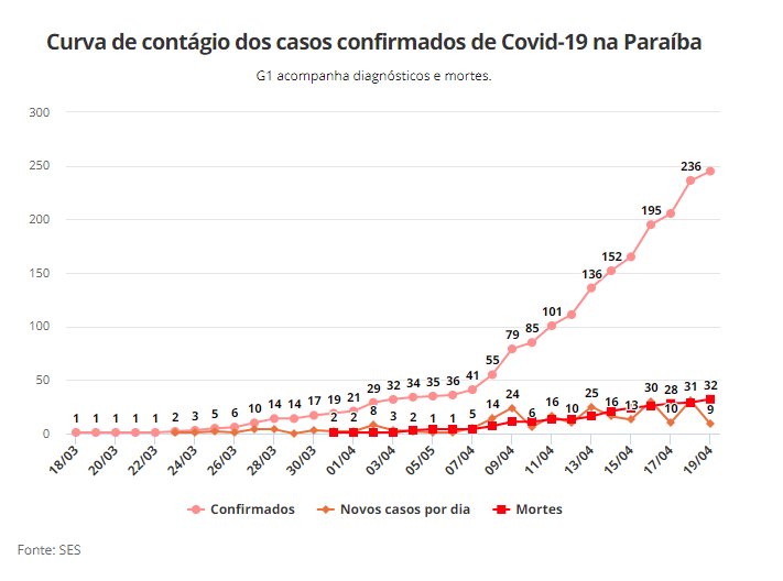 João Pessoa, no entanto, é a cidade com o maior número de casos e representa 70% do total de casos confirmados até este domingo (19). A prefeitura da cidade decretou por mais 15 dias a suspensão de alguns serviços, como a circulação dos transportes públicos e o funcionamento de comércio e escolas. A prorrogação das medidas terá validade até o dia 3 de maio.