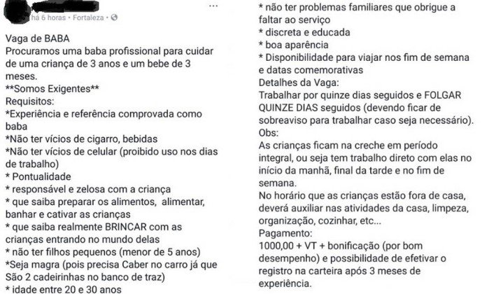 O anúncio de uma vaga de emprego para babá publicado no Facebook por uma mulher de Fortaleza está causando revolta nas redes sociais. Entre vários requisitos, a vaga exige que a funcionária tenha boa aparência e seja ‘magra para caber no carro’ junto com as cadeirinhas das crianças no banco de trás. A oferta de trabalho é para cuidar de uma criança de 3 anos e um bebê de 3 meses e oferece remuneração de R$ 1 mil para 15 dias de trabalho consecutivos seguidos de 15 dias de folga “de sobreaviso caso seja necessário trabalhar”.