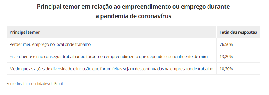 Sobre as profissionais negras que estão alocadas em empresas nacionais e multinacionais, o levantamento aponta que 76,5% têm medo de perder o emprego, enquanto 13,2% temem pela saúde e 10,3% estão receosas com a manutenção de ações de diversidade e inclusão.