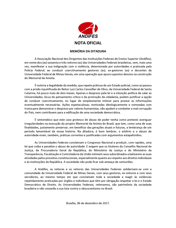 Nós, intelectuais, professores, estudantes e dirigentes de instituições acadêmicas, vimos a público manifestar nossa perplexidade e nosso mais veemente protesto contra as ações judiciais e policiais realizadas contra a universidade pública que culminaram na invasão do campus da UFMG e na condução coercitiva de reitores, dirigentes e administradores dessa universidade pela Polícia Federal no dia 6 de dezembro de 2017. O Brasil, nos últimos anos, vivencia a construção de elementos de exceção legal justificados pela necessidade de realizar o combate à corrupção. Prisões preventivas injustificáveis, conduções coercitivas ao arrepio do código penal tem se tornado rotina no país.