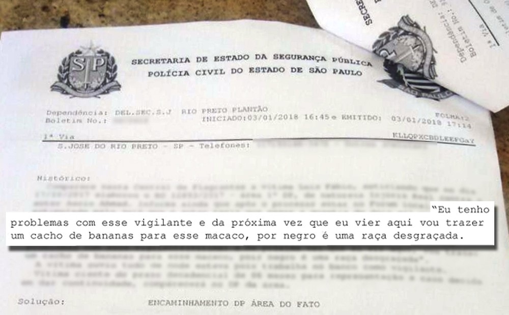 Segundo o boletim de ocorrência registrado pelo segurança, o idoso teria o chamado de “macaco” para a caixa do banco e a vítima ouviu o insulto. “Ele disse que negro é de uma raça desgraçada e que levaria um cacho de bananas para mim”, afirma.