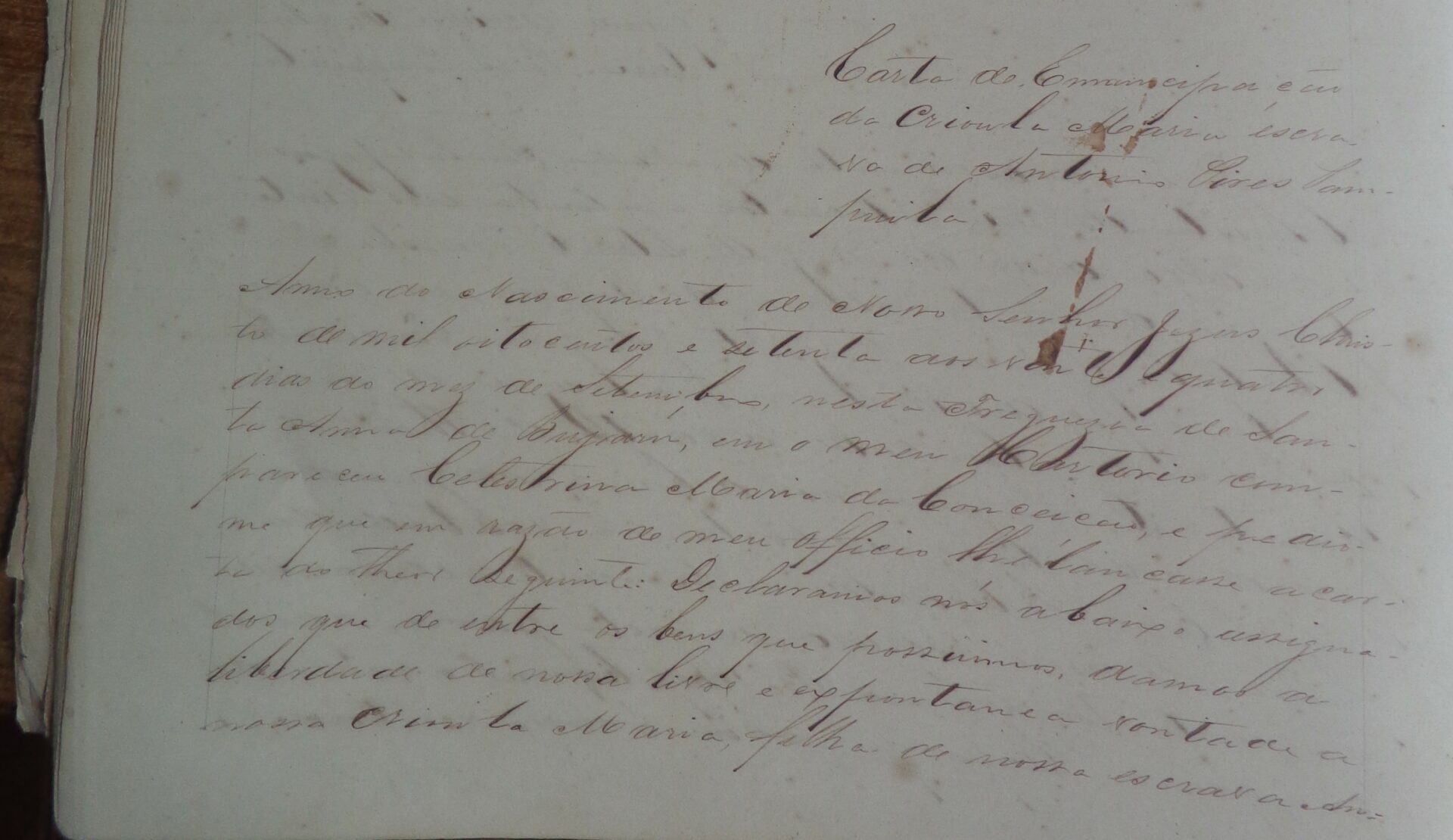 Outra carta de alforria existente no antigo cartório de Santa Anna de Bujaru, que mostro aqui, é de uma criança de nome Maria, filha da escravizada Anna Catharina. Ambas pertenciam ao casal Pampolha, proprietários também do escravizado João do início do texto. Este casal possuía vários bens, como terras e escravizados, nas margens do igarapé Arapiranga, um dos maiores braços afluentes do rio Bujaru, vizinho do igarapé Cravo. Maria era mais uma cativa dessa família, que teve sua carta de alforria lavrada em cartório naquele mesmo dia 24 de setembro de 1870. Recém-nascida, precisou que sua madrinha, Celestina Maria da Conceição – descrita como comadre do casal Pampolha –, levasse sua carta ao cartório, diferente de João que, adulto, pôde ir pessoalmente lavrar a sua própria carta.
