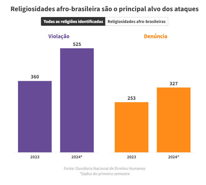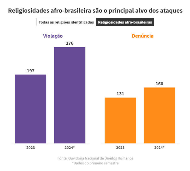 As religiosidades afro-brasileiras são o principal alvo dessa intolerância. De 525 violações em que a religião da suposta vítima foi identificada, 276 envolvem adeptos de crenças de matriz africana. Essas violações, registradas no primeiro semestre de 2024, estão distribuídas em 160 denúncias.
