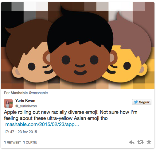 Também no Twitter, a usuária Yurie Kwon diz, ao comentar uma notícia do site Mashable: “A Apple está liberando novos emojis com diversidade racial. Mas não estou certa sobre como me sinto sobre aquele emoji asiático ultra-amarelo.”