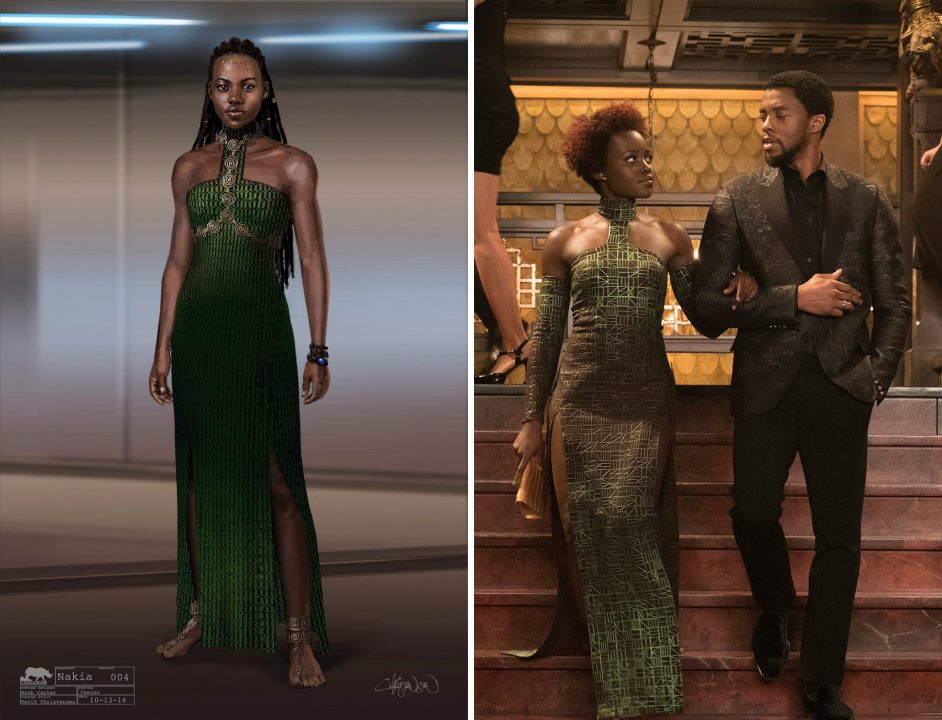 O traje para Nakia, interpretado por Lupita Nyong’o, deram os maiores saltos, disse Carter. A Tribo do Rio da espiã foi baseada em parte no povo Suri da Etiópia, então seu olhar tradicional era feito de conchas, esferas e folhas.