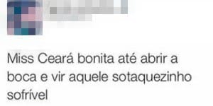 Após a vitória da cearense no concurso de miss, ela foi alvo de comentários preconceituosos. “Miss Ceará bonita até abrir a boca e vir aquele sotaquezinho sofrível”, diz uma das mensagens. “Lembrem de deixar a TV no mudo quando a miss Ceará for dar a palestra dela no miss Brasil do ano que vem”, diz outra.