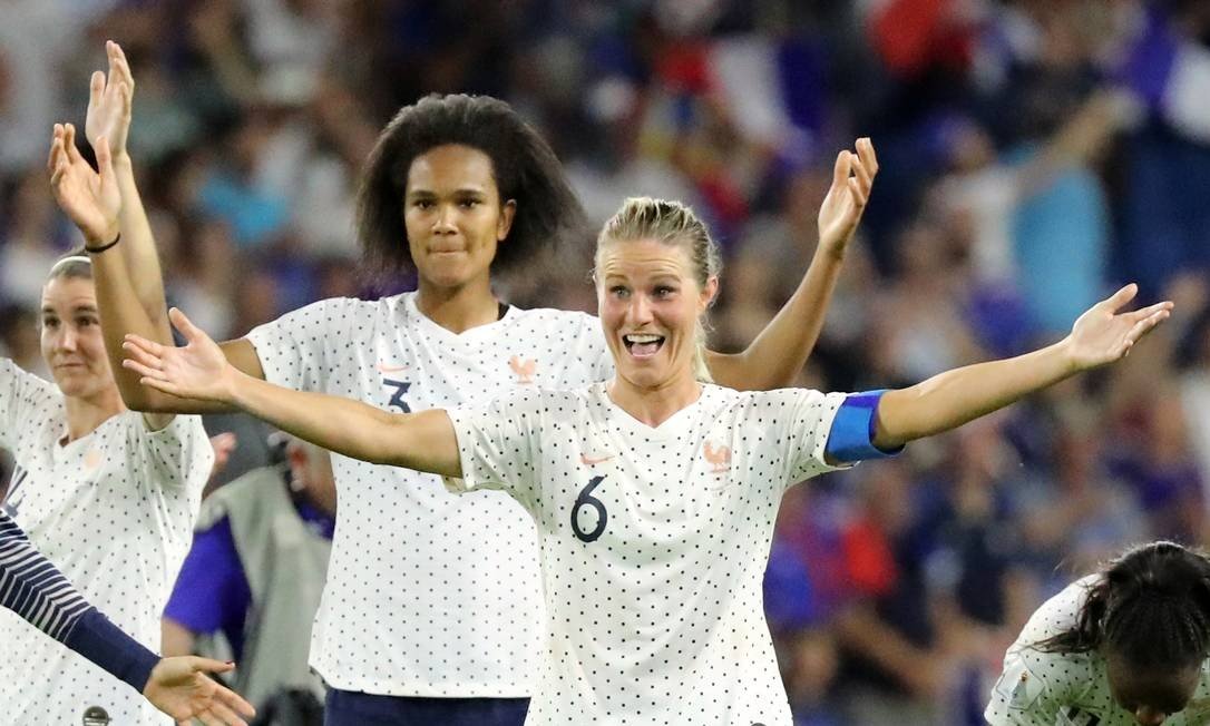 Wendie Renard e Amandine Henry celebram a vitória do jogo Foto- LUCY NICHOLSON : REUTERS