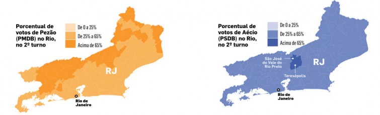 Apoiado por praticamente toda a cúpula do PMDB fluminense, Aécio Neves (PSDB) buscou popularizar no Rio a chamada “chapa Aezão”, na esperança de que os eleitores de Luiz Fernando Pezão (PMDB) votassem também nele. Os mapas de votação de ambos, porém, mostram que não houve sintonia eleitoral.
