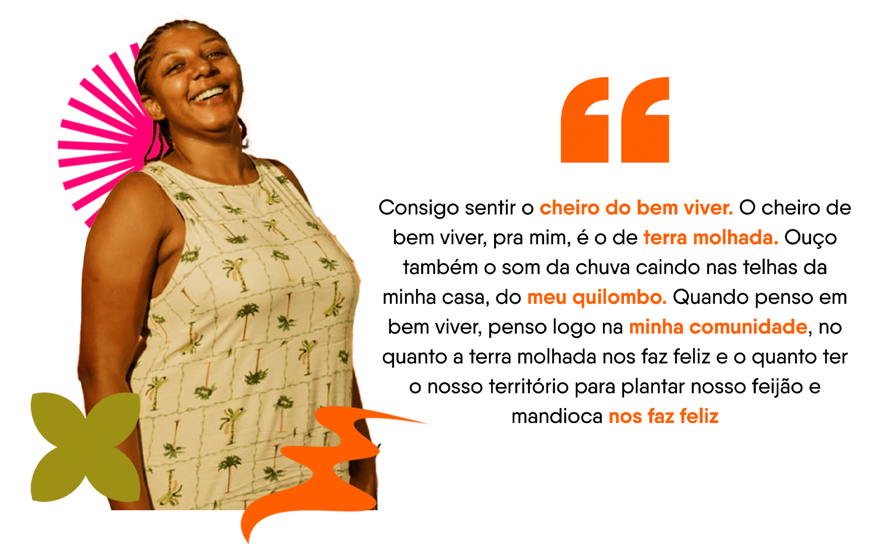“Consigo sentir o cheiro do bem viver. O cheiro de bem viver, pra mim, é o de terra molhada. Ouço também o som da chuva caindo nas telhas da minha casa, do meu quilombo. Quando penso em bem viver, penso logo na minha comunidade, no quanto a terra molhada nos faz feliz e o quanto ter o nosso território para plantar nosso feijão e mandioca nos faz feliz”, relata.