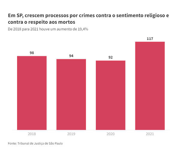 De 2018 até abril de 2022 o Tribunal de Justiça de São Paulo registrou 447 novos processos por crimes contra o sentimento religioso e contra o respeito aos mortos. Eles estão sob o mesmo código de assunto no CNJ (Conselho Nacional de Justiça), e por isso os tribunais rastreiam de forma conjunta. O levantamento foi feito a pedido de Universa.