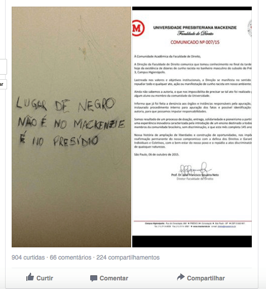 O caso foi denunciado por alunos nas redes sociais e logo viralizou. A estudante Tamires Gomes Sampaio, diretora do Centro Acadêmico João Mendes Jr., do curso de Direito da Mackenzie, e segunda vice-presidente da União Nacional dos Estudantes (UNE), lamentou que o ato criminoso e racista represente aquilo “que passa na cabeça de muitos que permeiam pelo Mack”.