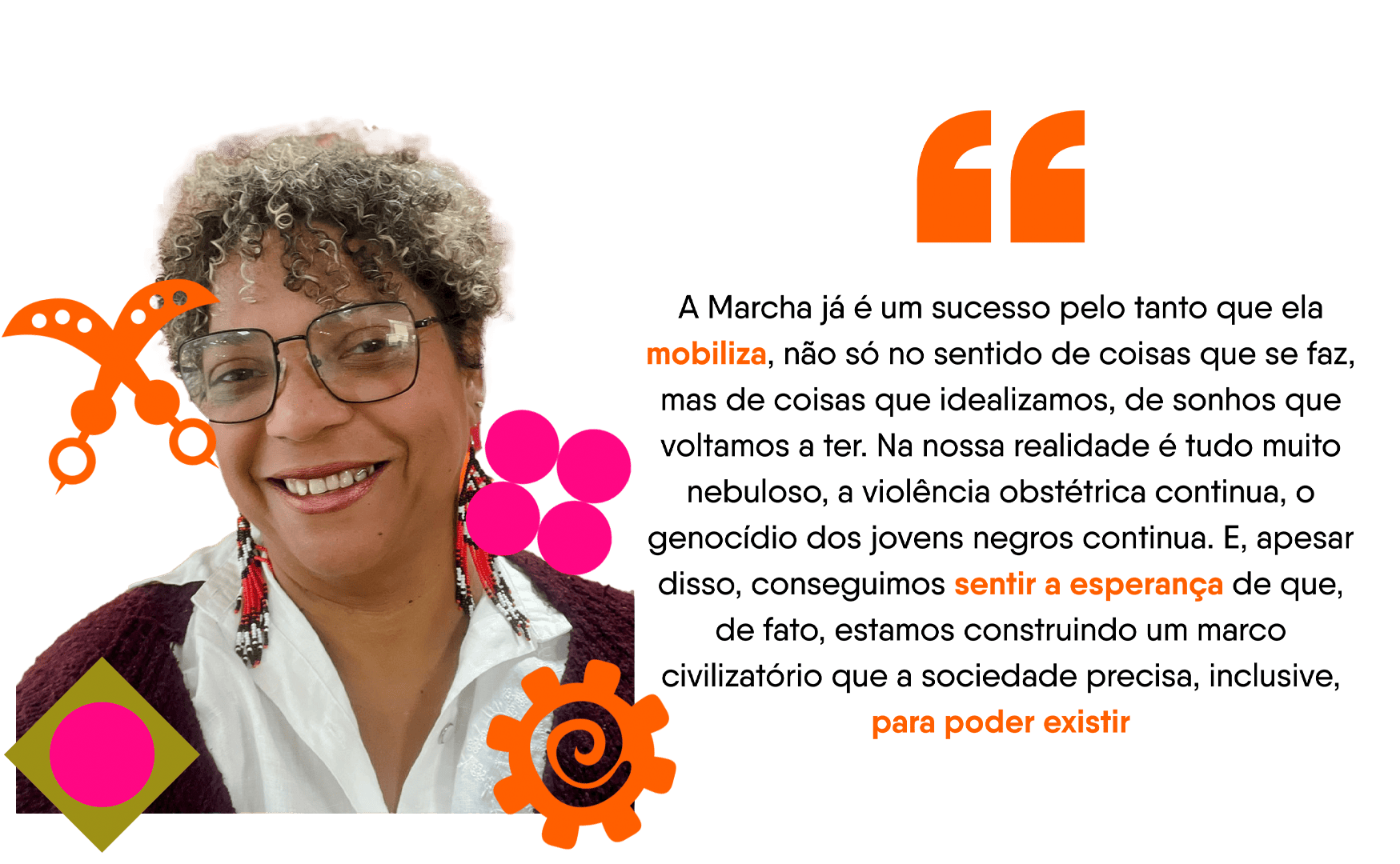 “A Marcha já é um sucesso pelo tanto que ela mobiliza, não só no sentido de coisas que se faz, mas de coisas que idealizamos, de sonhos que voltamos a ter. Na nossa realidade é tudo muito nebuloso, a violência obstétrica continua, o genocídio dos jovens negros continua. E, apesar disso, conseguimos sentir a esperança de que, de fato, estamos construindo um marco civilizatório que a sociedade precisa, inclusive, para poder existir”.