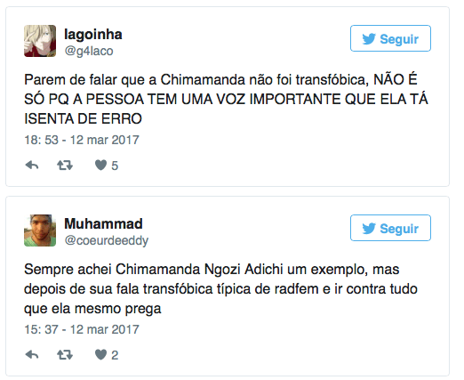 De acordo com Uwuajaren, o pensamento de Adichie não consegue reconhecer que ela “não tem lugar de fala para dizer como as mulheres trans devem ser ou se sentir no mundo.”