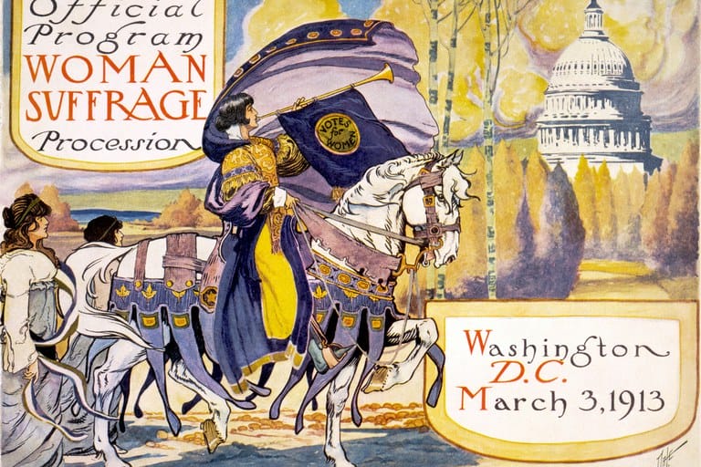 Programa oficial da Parada pelo Sufrágio das Mulheres, de 1913, com as cores branca, roxa e dourada