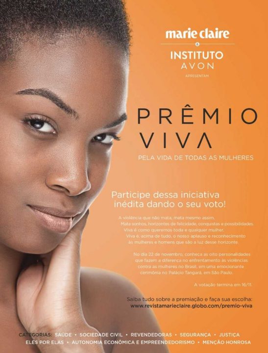 Atenta a essa triste dado, Marie Claire se uniu ao Instituto Avonpara criar o Prêmio Viva, que visa reconhecer pessoas atuantes no enfrentamento das tantas violências contra a mulher no Brasil. “Queremos mostrar que violência não é só física. Um relacionamento abusivo e a não equidade salarial entre mulheres e homens que exercem a mesma função, por exemplo, também são formas de violência. Com esse prêmio queremos levantar a discussão e alertar a população”, explica Laura Ancona, diretora de redação da revista.