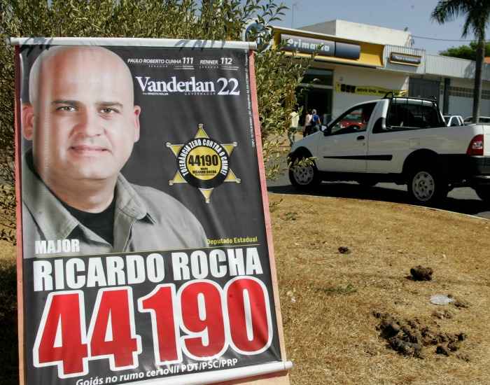 Cartaz do candidato a deputado estadual Ricardo Rocha, suspeito de envolvimento em crimes e com grupo de extermínio em Formosa e interior de Goiás