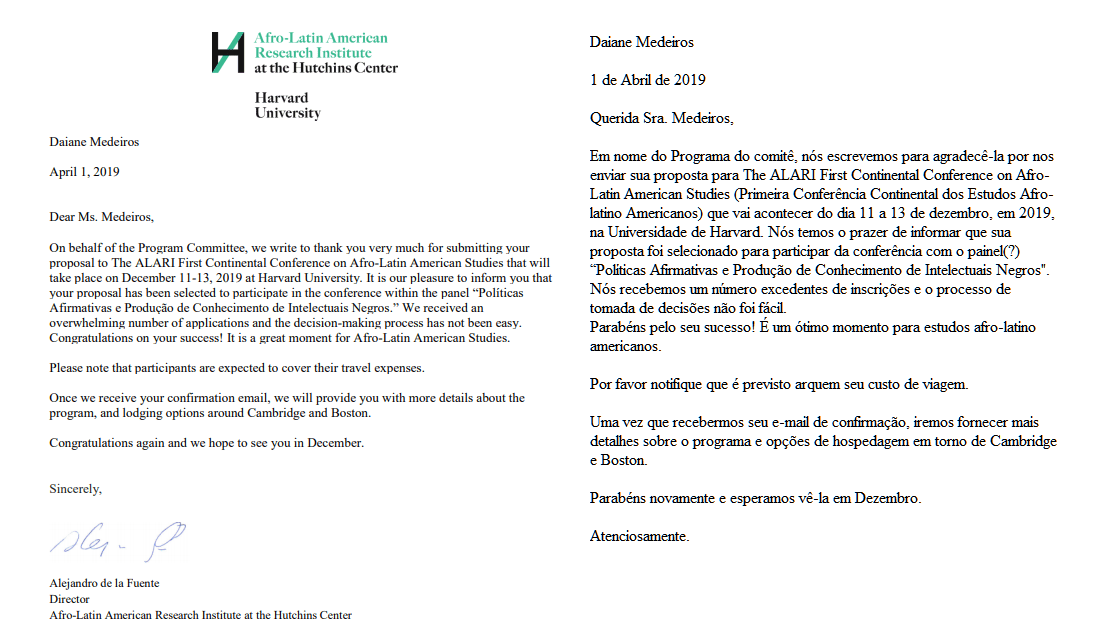 We, Anderson Alves, Daiane Medeiros e Sharah Elisa, young black studants recently graduated in pedagogy, by FEBF – UERJ, and originating from Baixada Fluminense and Western Zone of Rio de Janeiro, had our academic work/project entitled “Políticas Afirmativas e Produção de Conhecimentos de Intelectuais Negros – Affirmative Policies and Knowledge Production of Black Intellectuals” selected for the First Continental Conference on Afro-Latin America Studies, that will take place at Harvard University in Cambridge – EUA, between December 11-13, 2019. This extraordinary opportunity to present our work at HARVARD allow us, through the public education and research, new possibilities to narrate our histories and share with the world the knowledge produced by us, young black and Brazil’s peripherals.