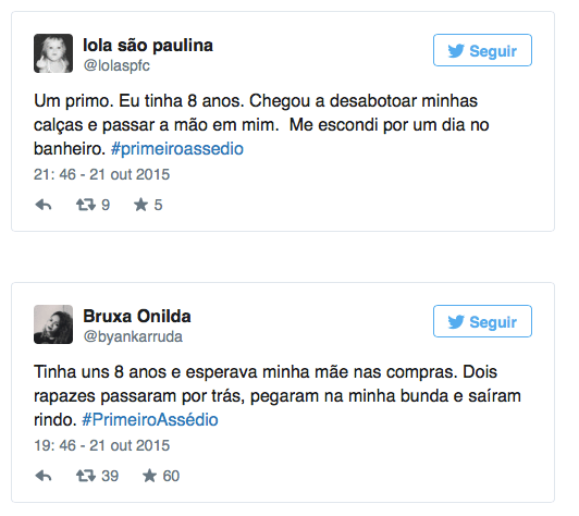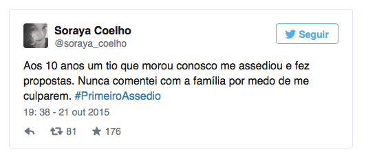 Assim que o caso ganhou as redes sociais, o coletivo feminista Think Olga, que luta contra o assédio em espaços públicos e outros tipos de violência contra a mulher, lançou a hashtag #primeiroassédio no Twitter, incentivando mulheres a contar quando foi a primeira vez que foram assediadas — e expor um problema que é tão enraizado, que é entendido como “brincadeira” ou “normal”.
