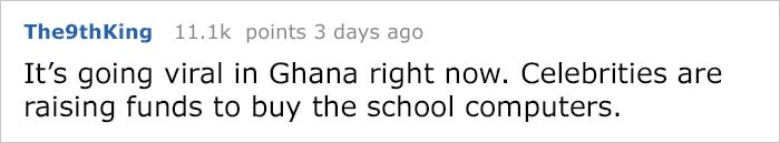Viralizou em Gana. Celebridades estão fazendo campanha para angariar fundos para comprar computadores para a escola.