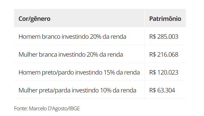 Tirando como base os dados do IBGE, D’Agosto constatou que, em 30 anos, a diferença de patrimônio acumulado entre um homem branco e uma mulher negra chegaria, no cenário mais extremo, ao equivalente a R$ 790 mil em valores atuais.