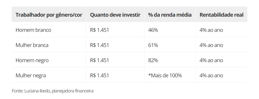 Considerando a renda média de R$ 1.394 divulgada pelo IBGE, a planejadora financeira Luciana Ikedo calcula que a mulher negra não conseguiria atingir o equivalente (corrigido pela inflação) a R$ 1 milhão no prazo de 30 anos nem que investisse todo o seu salário numa aplicação de renda fixa com 4% de ganho real ao ano.