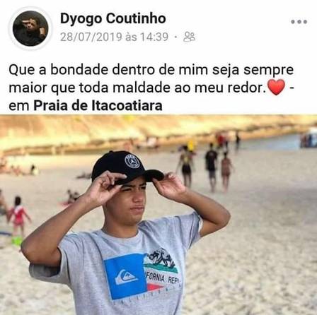 O jovem jogador de futebol Dyogo Costa Xavier de Brito, de 16 anos, morto após uma operação policial na comunidade da Grota, no bairro São Francisco, em Niterói, fez uma publicação nas redes sociais há menos de um mês pedindo proteção e destacando os problemas que cercam a sociedade. “Que a bondade dentro de mim seja sempre maior que toda maldade ao meu redor”, diz o texto postado no perfil de Dyogo com uma foto do jovem na Praia de Itacoatiara, na cidade de Niterói.