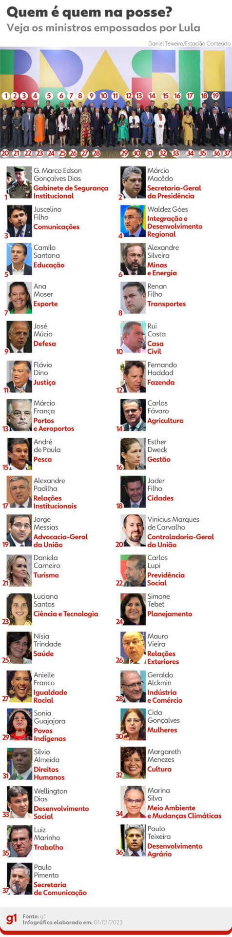 Veja abaixo a lista de todos os ministros anunciados por Lula, na ordem da foto oficial (da esquerda para a direita e da fileira de cima para a de baixo).