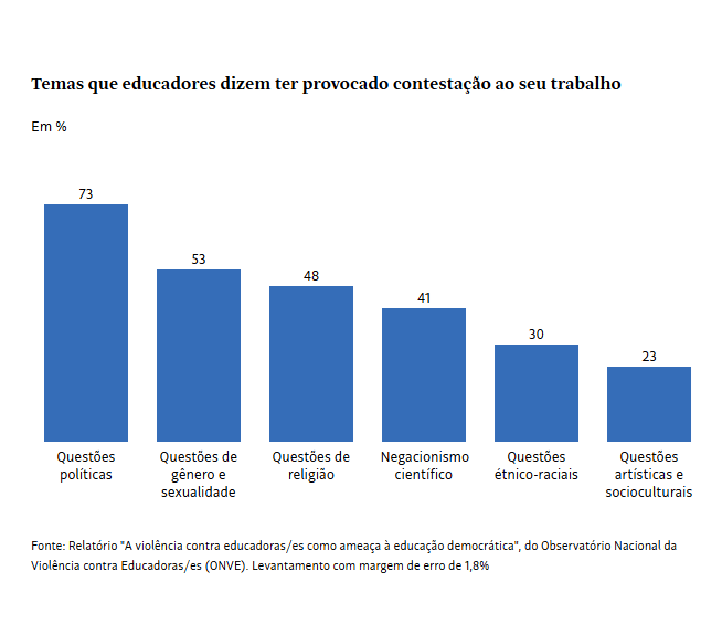 Um estudo recente publicado pelo ONVE (Observatório Nacional da Violência contra Educadores), também vinculado à UFF, em parceria com o Ministério da Educação, aponta que, para 48% dos educadores que relataram contato direto ou indireto com algum tipo de perseguição e censura nas escolas, a principal motivação foi religiosa. O levantamento indica que 9 em cada 10 educadores já sofreram ou presenciaram algum tipo de perseguição e censura.