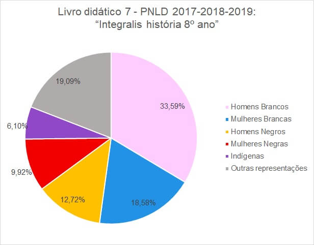 No que tange às imagens das mulheres negras no material didático analisado, elas são representadas 39 vezes, o que corresponde apenas a 9,92% do total de todos os sujeitos históricos apresentados no livro. A saber: os homens brancos 132 vezes ou 33,58%; mulheres brancas 73 vezes ou 18,57%; homens negros 50 vezes ou 12,72%; indígenas 24 vezes ou 6,10%. As imagens sem pessoas identificadas aparecem 75 vezes ou 19,08%, ou seja, o conjunto de paisagens, mapas e gráficos tem maior expressividade numérica do que pessoas negras e indígenas. Uma vez que as mulheres negras representam 28% da população brasileira, podemos dizer que elas estão invisibilizadas ou sub-representadas no material. Com efeito, é importante questionar: Quando as mulheres negras são representadas no livro, o que as imagens dizem sobre elas?