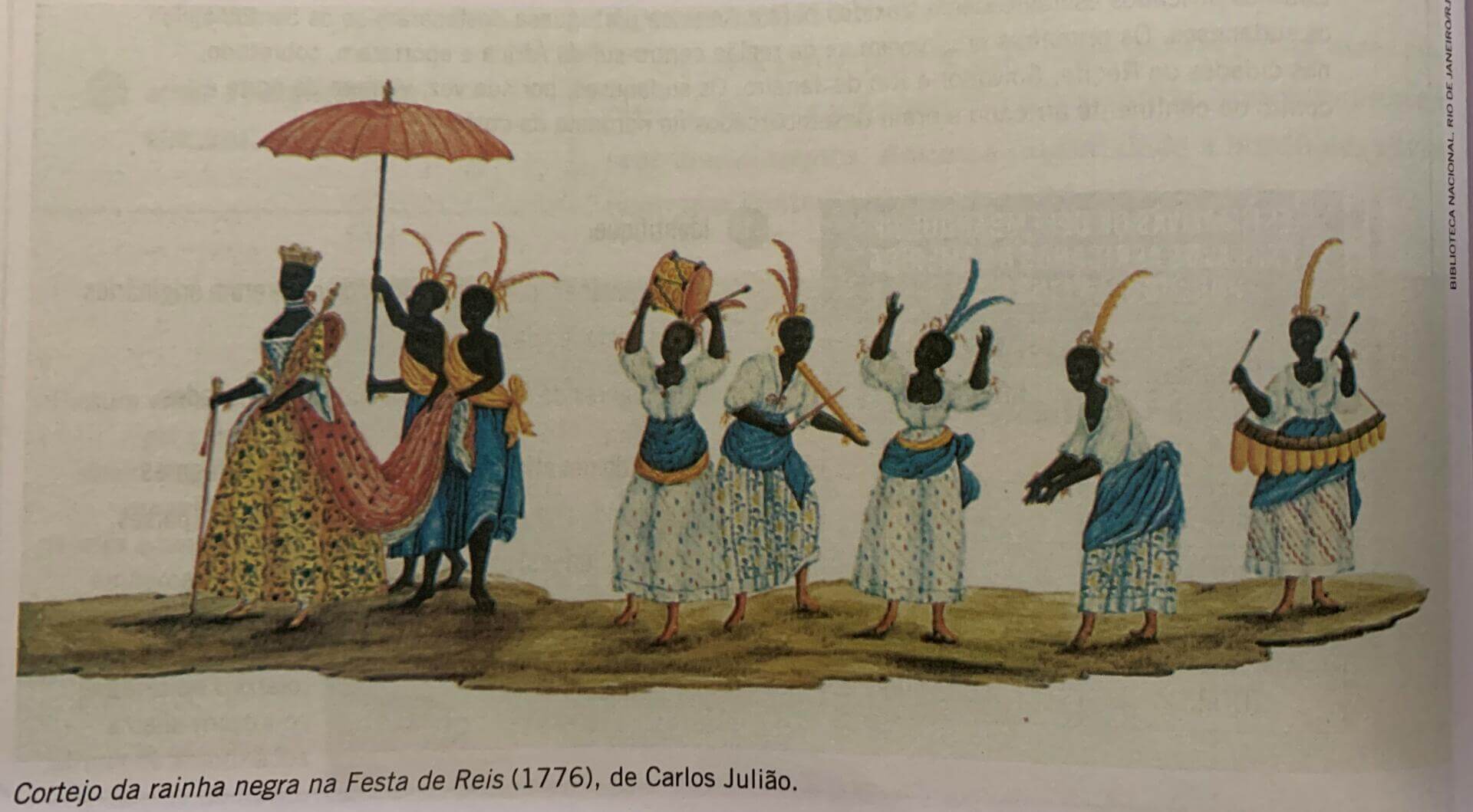 As imagens acima retratam a Festa de Reis, em Minas Gerais, no século XVIII. Aqui, é visível o protagonismo e as representações positivas das mulheres negras. Nessas iconografias, elas aparecem bem trajadas, com adornos na cabeça, dançando e festejando. Esse aspecto deve ser reforçado em sala de aula como um meio de valorizar a autoestima das alunas negras, vinculando a história com seu protagonismo enquanto estudantes e cidadãs. Isso favorece a autodeterminação de sua negritude que pode ser construída por meio de representações positivas.