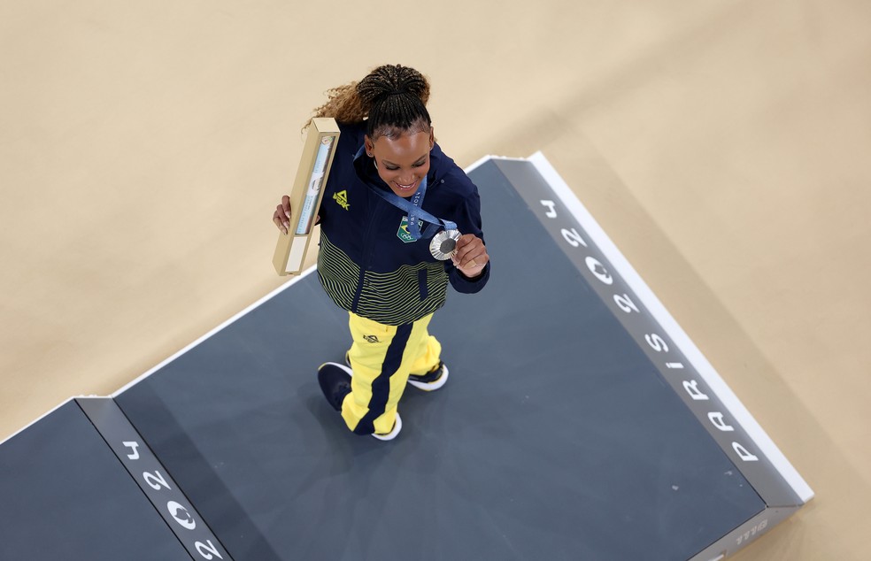 Rebeca Andrade igualou o recorde de Robert Scheidt e Torben Grael de cinco medalhas em Olimpíadas ao conquistar a prata do salto neste sábado, em Paris. A ginasta de 25 anos ainda tem mais duas finais na segunda-feira (trave e solo) e tem boas chances de se isolar como a maior atleta da história do Brasil em número de pódios nos Jogos. Ela brincou com a marca.