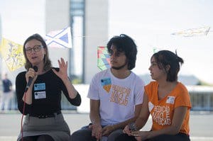 A deputada federal e ex-ministra dos Direitos Humanos Maria do Rosário conversa com manifestantes em Brasília