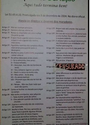 Em um de seus artigos os estudantes escreveram: “nunca se deve bater em uma mulher, ela pode gostar”. E o cartaz segue com uma sequência de artigos machistas como: “o que é bom a gente come e mostra; o que é ruim a gente não mostra, mas come”, diz. Em outras frases eles pegam mais pesado dizendo: “é vedada toda e qualquer recriminação aos moradores que embebedar uma mulher para pegá-la”. O cartaz foi postado nas redes sociais e recebeu compartilhamentos e comentários contrários aos dizeres.