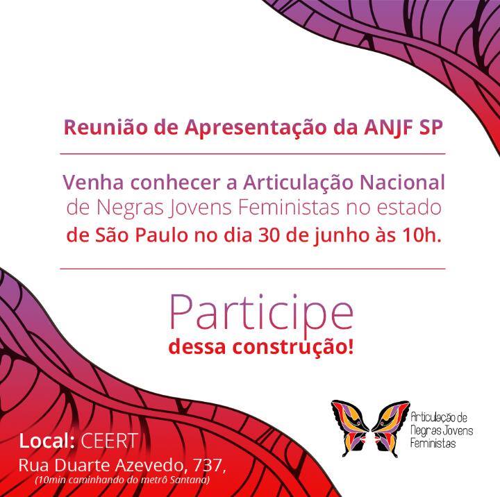 A Articulação Nacional de Negras Jovens Feministas do estado de São Paulo, convida coletivos, organizações, grupos e demais iniciativas de negras jovens feministas para nossa primeira atividade pós II Encontro Nacional de Negras Jovens Feministas (IIENJF).