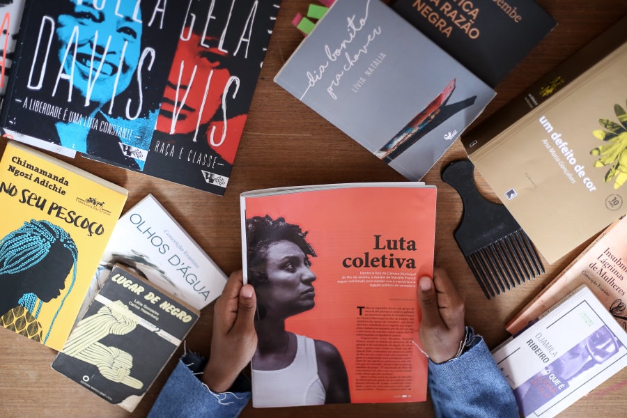 “Eu construo a minha intelectualidade através dos meus, das pessoas que eu sei que falam sobre a minha experiência. Eu sou fruto de minha mãe Cristina Soares e minha avó Junilia Arcanjo. Quando eu leio Tornar-se Negro, de Neuza Santos, eu sei que ela está falando das experiências que eu vivencio enquanto mulher negra. Quando eu leio os poemas de Lívia Natália e de Conceição Evaristo, isso me fortalece para que eu consiga ter em mente qual caminho eu quero seguir. Por mais que a sociedade diga que a gente é marginal, temos que ser fortaleza e resistência, mostrar que podemos ser médicos, advogados, professores, e que também pode ser empregada doméstica se quiser. Que a gente escolha onde estar, que não seja uma herança”.