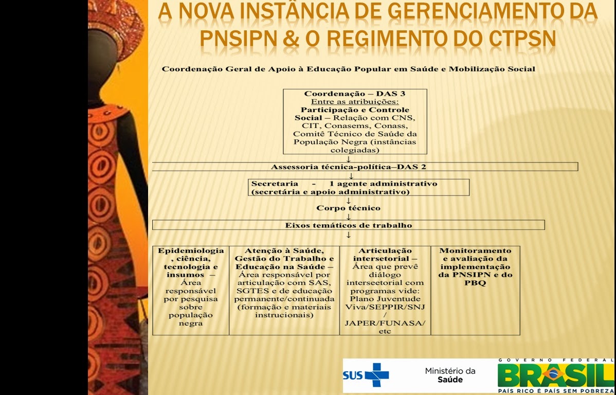Desde que a Política Nacional de Saúde Integral da População Negra (PNSIPN) foi aprovada pelo Conselho Nacional de Saúde (CNS), em 2006, e oficializada pelo Ministério da Saúde (MS), em 2009, por meio da Portaria n. 992/09, ativistas e especialistas da área têm lutado e dialogado com o MS para que a implementação aconteça. Os resultados, porém, praticamente inexistem; e boa parte da explicação repousa no fato de que essa agenda nunca foi incorporada como prioridade pelo Ministério. Apesar de 70% dos usuários do Sistema Único de Saúde (SUS) serem negros (pretos e pardos), a PNSIPN não tem sido tratada como uma ação estratégica pelas secretarias do Ministério e algo indispensável para que a missão do SUS se concretize. Em vez disso, a quase totalidade das ações que tratam da saúde da população negra está sob a responsabilidade do Departamento de Apoio à Gestão Estratégica e Participativa (DAGEP), parte da Secretaria de Gestão Estratégica e Participativa (SGEP).