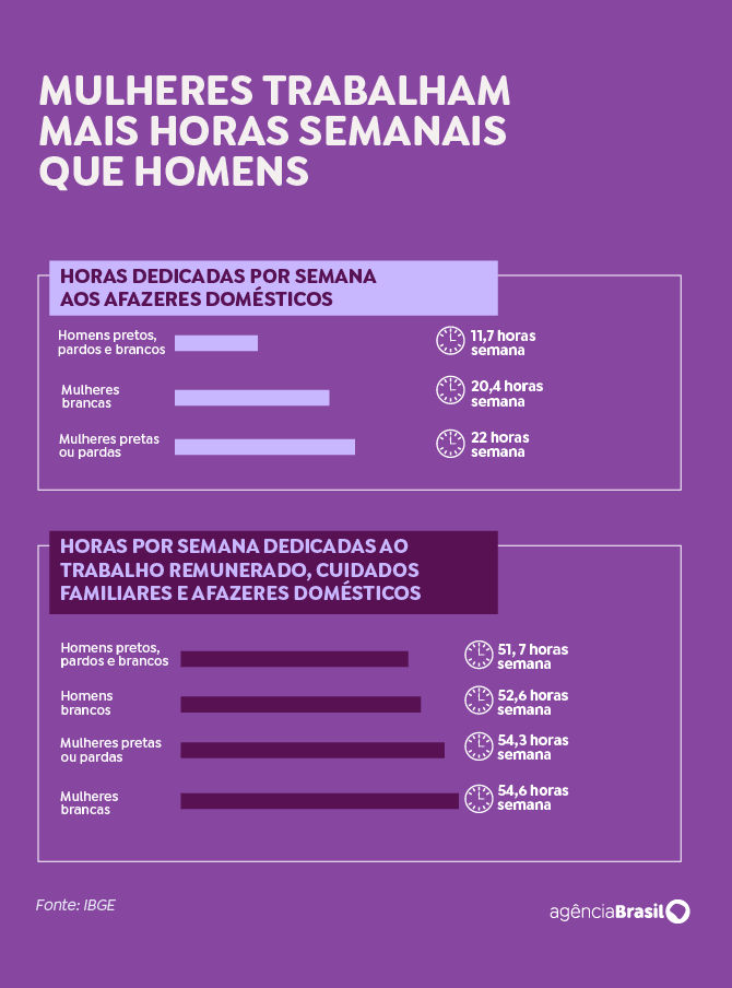 Ainda segundo o IBGE, as mulheres pretas ou pardas gastavam ainda mais tempo (22 horas) que as brancas (20,4) nas tarefas domésticas ou cuidado de pessoas, ou seja, 1,6 hora a mais.