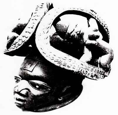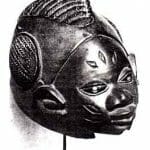 A devoção religiosa e as oferendas são temas destas máscaras. À esquerda, uma sacerdotisa, ajoelhada, e suas seguidoras; à direita, guerreiros rodeiam um sacerdote de Ogun, da região de Awori, que carrega uma bandeja contendo vários recipientes fechados e a cabeça de um cidadão de Oyo. British Museum, London, 1887.