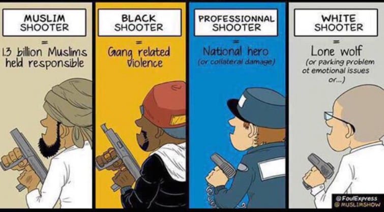 Ao longo dos últimos dias artigos de opinião e numerosos tweets expressaram a frustração sobre o duplo padrão racial que historicamente tem caracterizado a mídia norte-americana. Anthea Butler, Professora Adjunta de Religião e Estudos Africanos na Universidade da Pensilvânia argumenta que afro-americanos e muçulmanos “são rapidamente caracterizados como terroristas e bandidos, motivado pela intenção do mal em vez de injustiças externas”. Em contraste, ela diz que o homem branco atirador é descrito como “um homem solitário, perturbado ou mentalmente doente, um jovem que falhou pela sociedade”. Quanto a Dylann Roof, a âncora do tele-jornal da MSNBC foi relatada dizendo: “Nós ainda não sabemos a sua condição mental”.