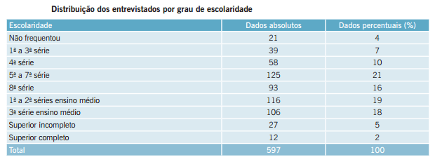 Pelos dados levantados nestas unidades, 4% dos detentos nunca tinha frequentado a escola. A grande maioria dos entrevistados (38%) não havia concluído o ensino fundamental, enquanto 16% cursaram até o final da etapa. Apenas 18% tinham o ensino médio completo e 5% possuíam diploma de ensino superior.