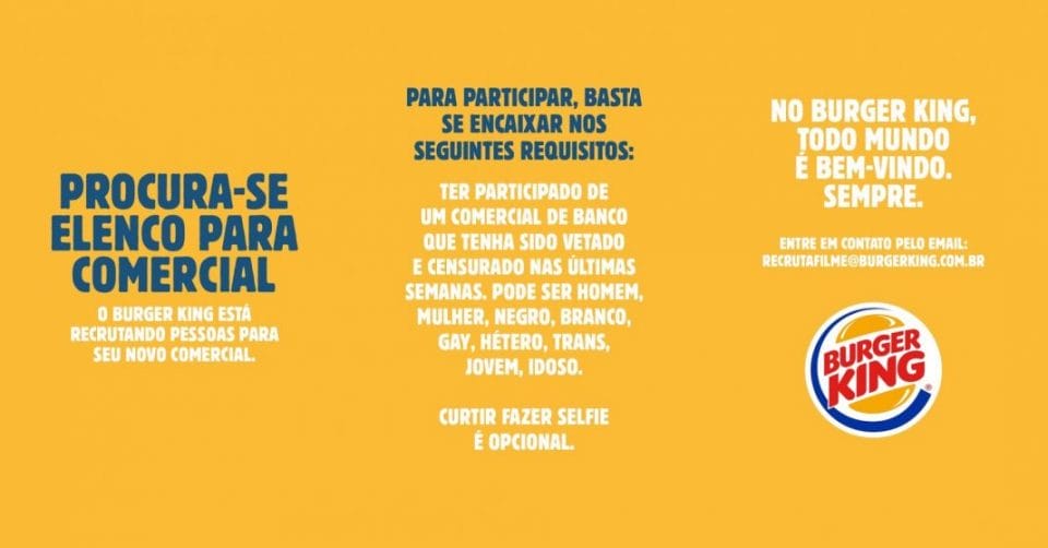Diversidade importa!: Burger King convoca elenco vetado em comercial do Banco do Brasil