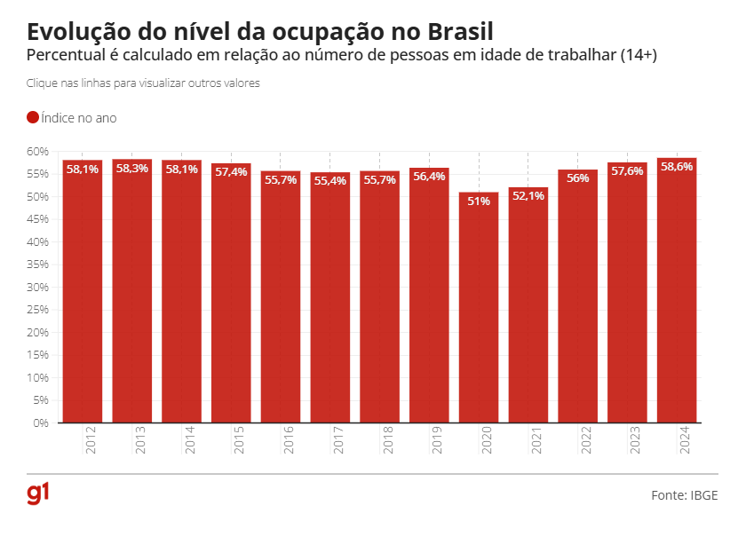 O país também bateu o recorde de pessoas ocupadas em 2024: mais de 103,3 milhões, na média do ano, uma alta de 2,6% em relação a 2023 (100,7 milhões).